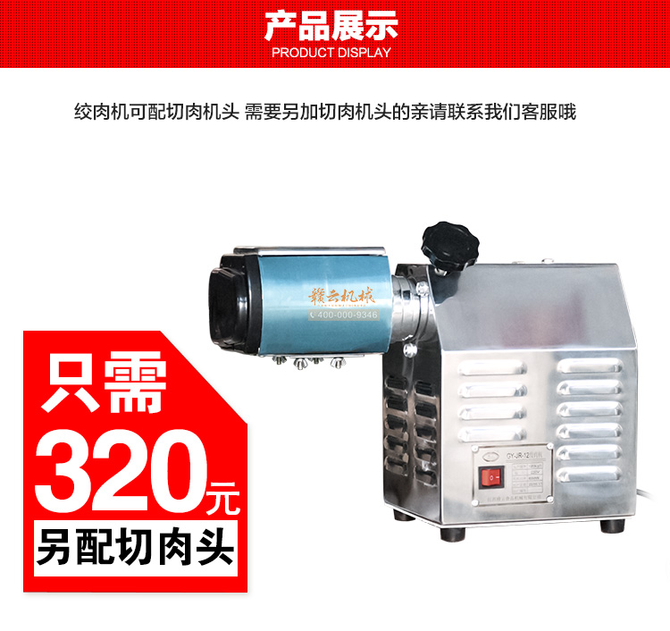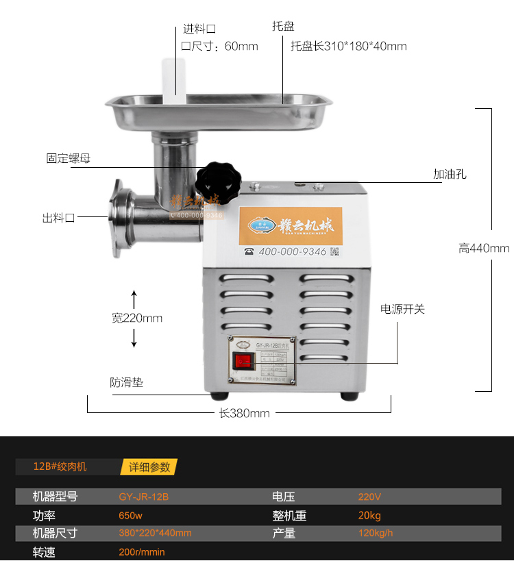 赣云台式电动12型绞肉机,出新款了,简介美观的外形设计,配备650w大功率纯铜电机,有效确保动力充足,可绞各种肉类,干货,鲜蔬等食品