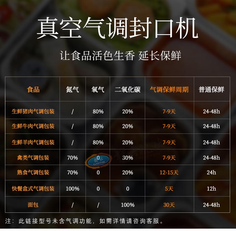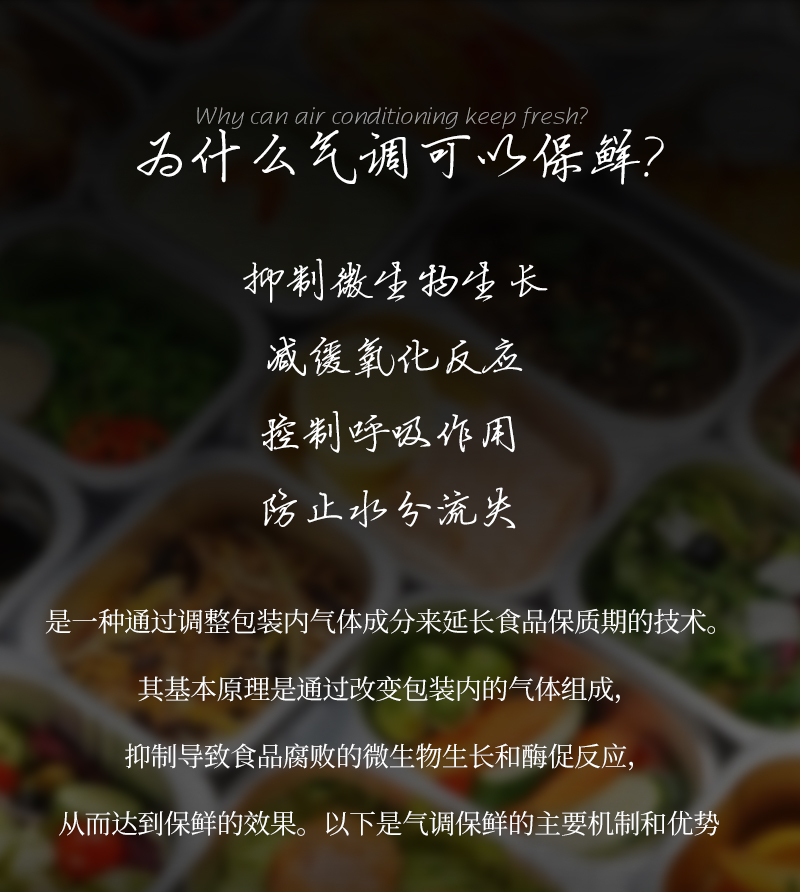 用于预制菜、熟食、果蔬等食品气调保鲜包装,通过调整包装内气体成分延长保鲜期,保持色香味及营养。