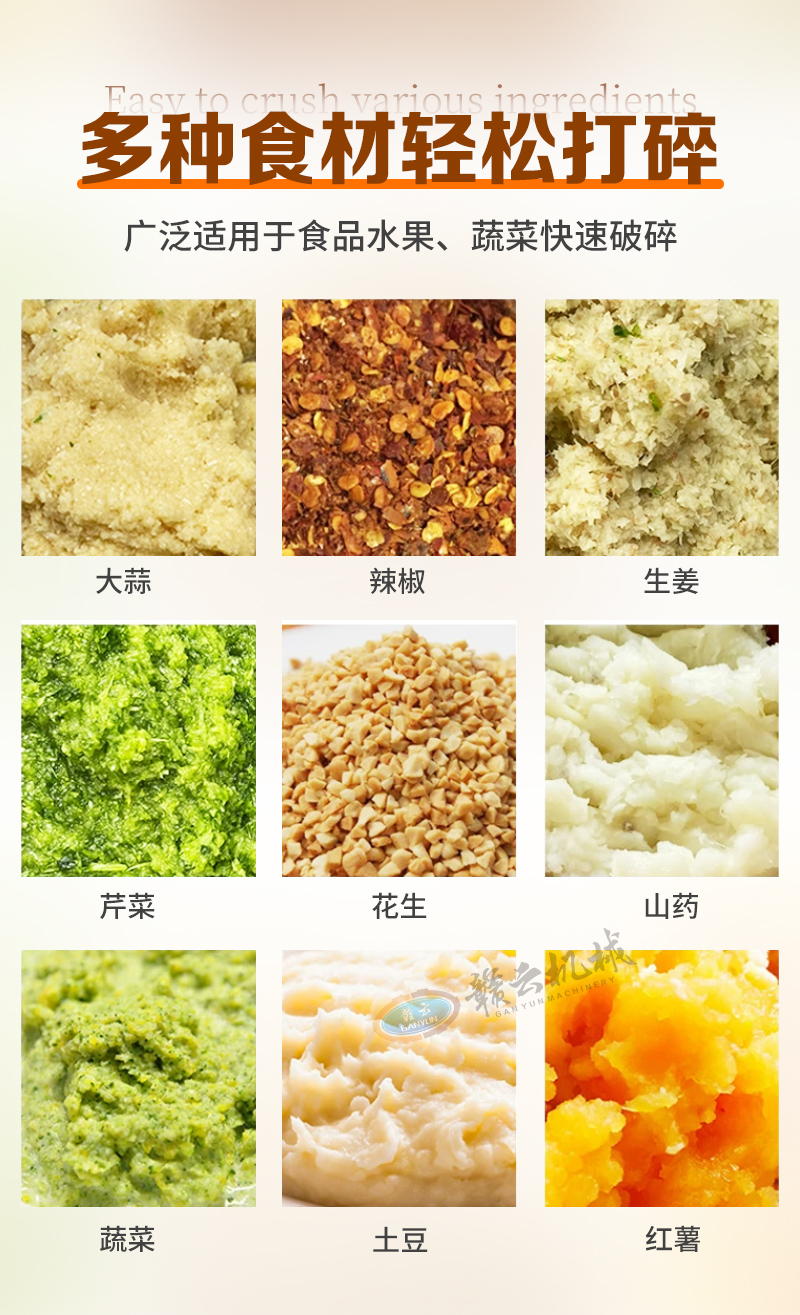 广泛适用于各类食品调料厂、餐饮后厨、净菜加工中心及果蔬制品企业。可快速完成生姜、大蒜、辣椒、胡萝卜、土豆、芹菜、花生等物料的破碎、打泥作业,亦适用于腌制类食材的前处理,满足不同精细度的加工需求