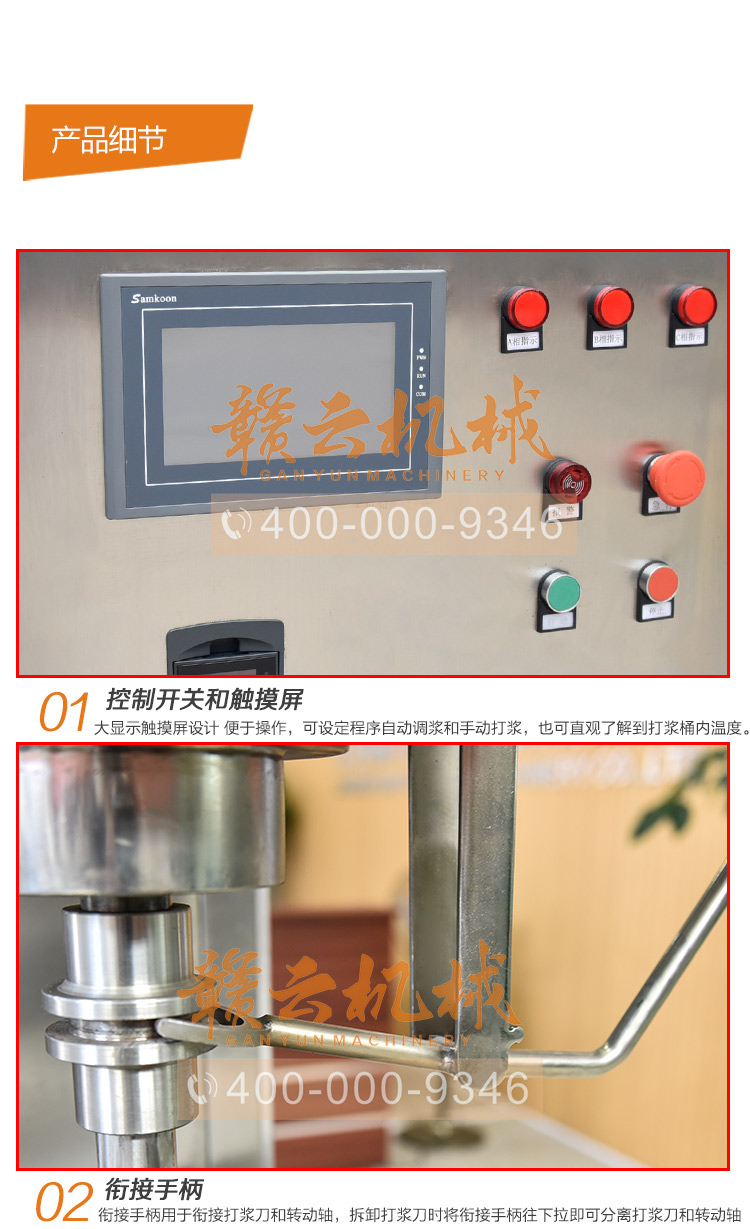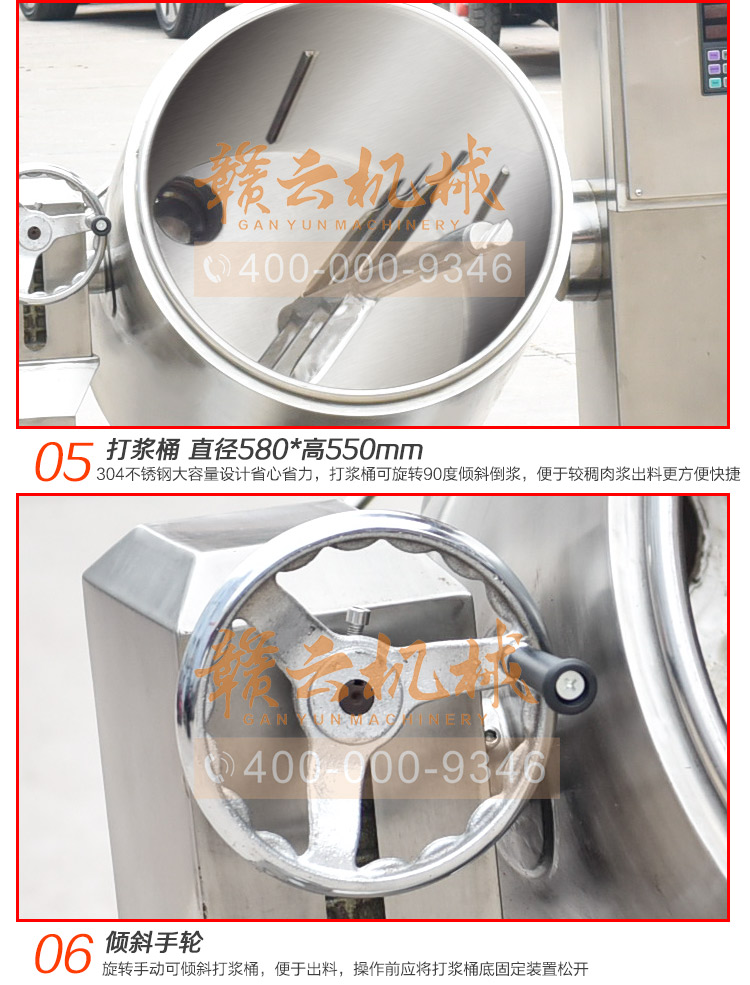 手自一体 程序智能打浆机赣云100l 180型肉丸打浆机,采用304不锈钢材质加工设计,通过设定打浆程序机器自动运转,定时定速分步骤调浆,亦可手动操作制浆,手自一体设计,操作简单 100l打浆桶容量,可制浆约180斤,可满足日产肉丸供应量为1吨厂家设备制浆需求,肉丸品种品质调速完毕,非工艺师均可操作产出同一口感品质产品。