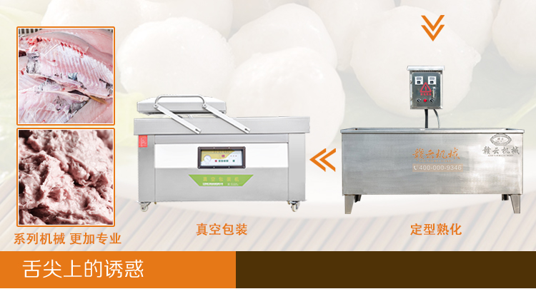 墨鱼丸成套,新鲜墨鱼加工成墨鱼丸设备,墨鱼丸机,本套设备由300不锈钢鱼肉采肉机、36型制冷慢速肉丸打浆机、180型墨鱼丸贡丸成型机、1500型智能温控双加热水槽和真空包装设备组合而成,生产新鲜墨鱼丸