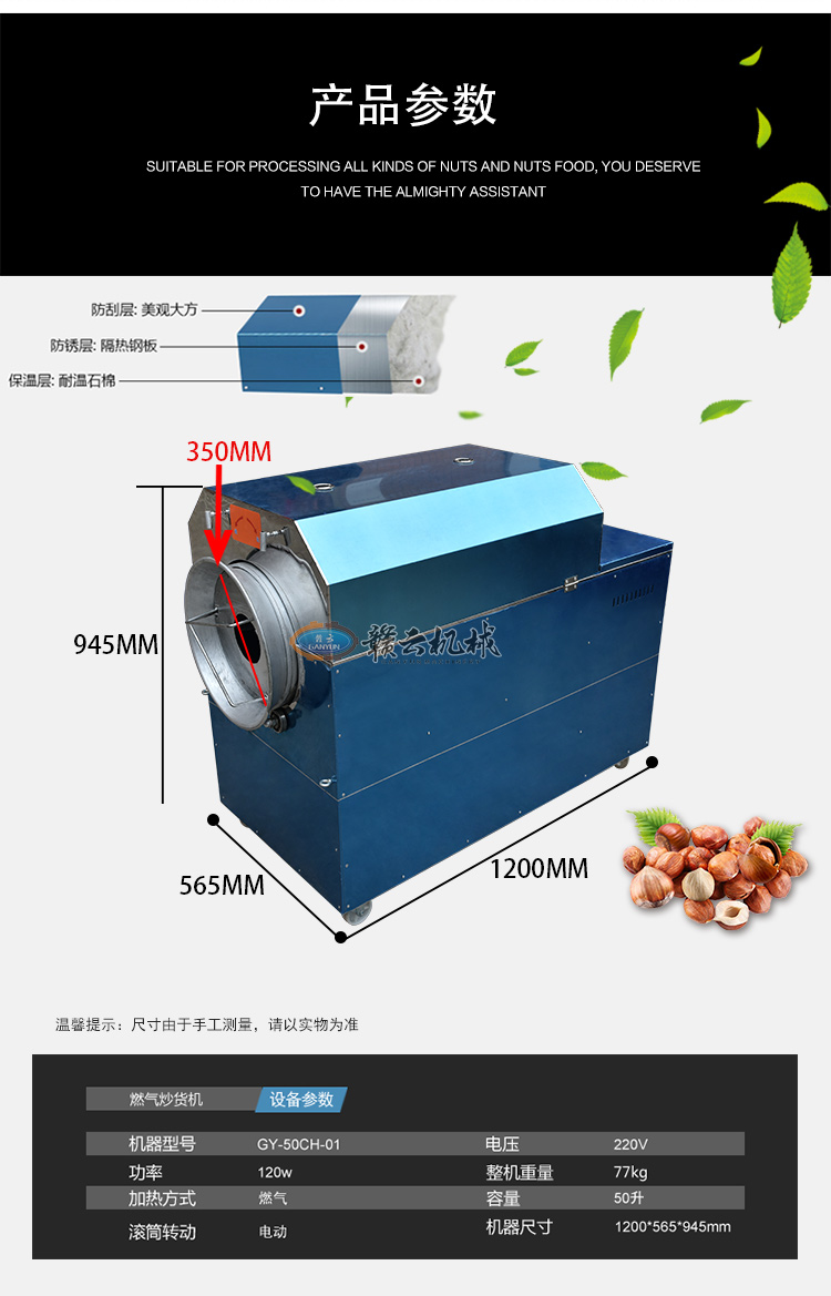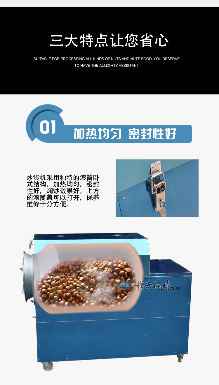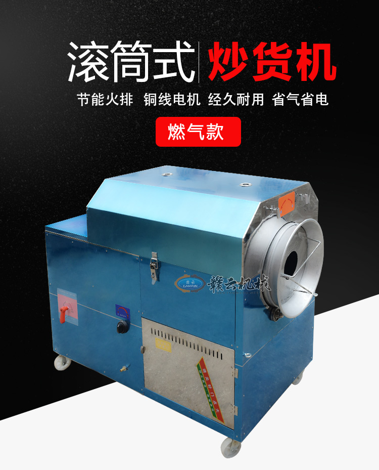 多功能炒货机集各种大中小型炒货机的优点为一体,可使用液化气或燃煤作为加热源,自动旋转、自动翻炒、自动出锅,整机采用优质不锈钢板加工成形,外观豪华气派,美观大方,清洁卫生,机器采用了先进的滚筒卧式结构,滚筒加热均匀,并有保温功能 , 工作时滚筒不停地旋转,使炒货食品上下、左右、前后、全方位立体翻炒,不会出现粘锅现象,炒制出的食品色泽金红亮丽,香气扑鼻。