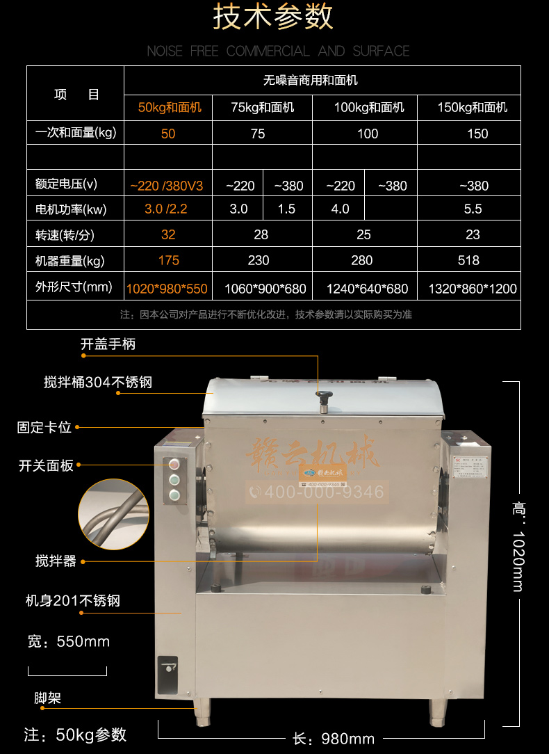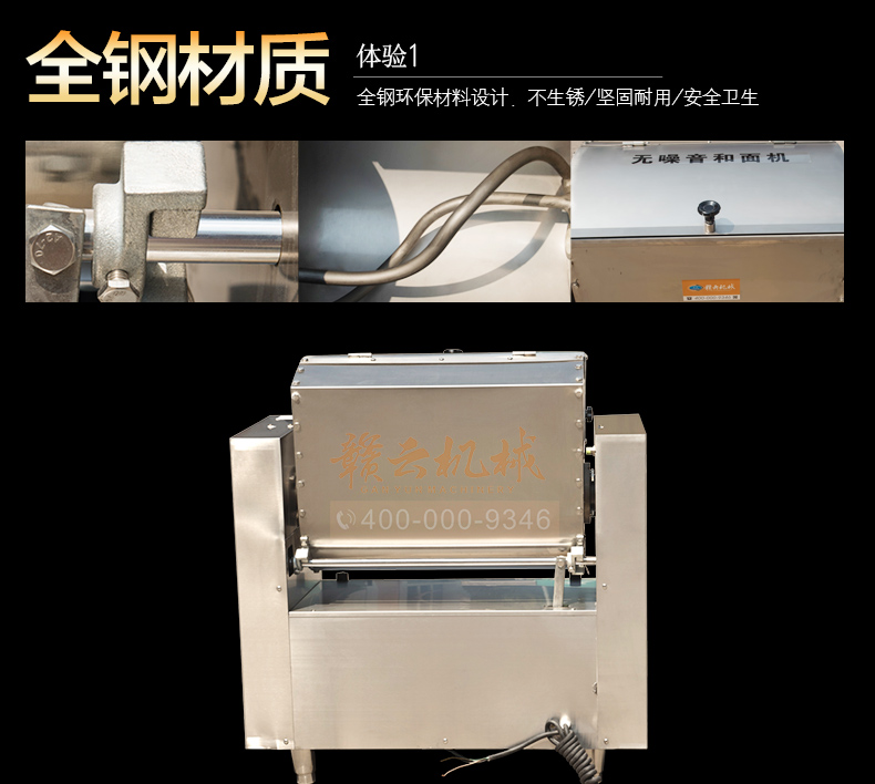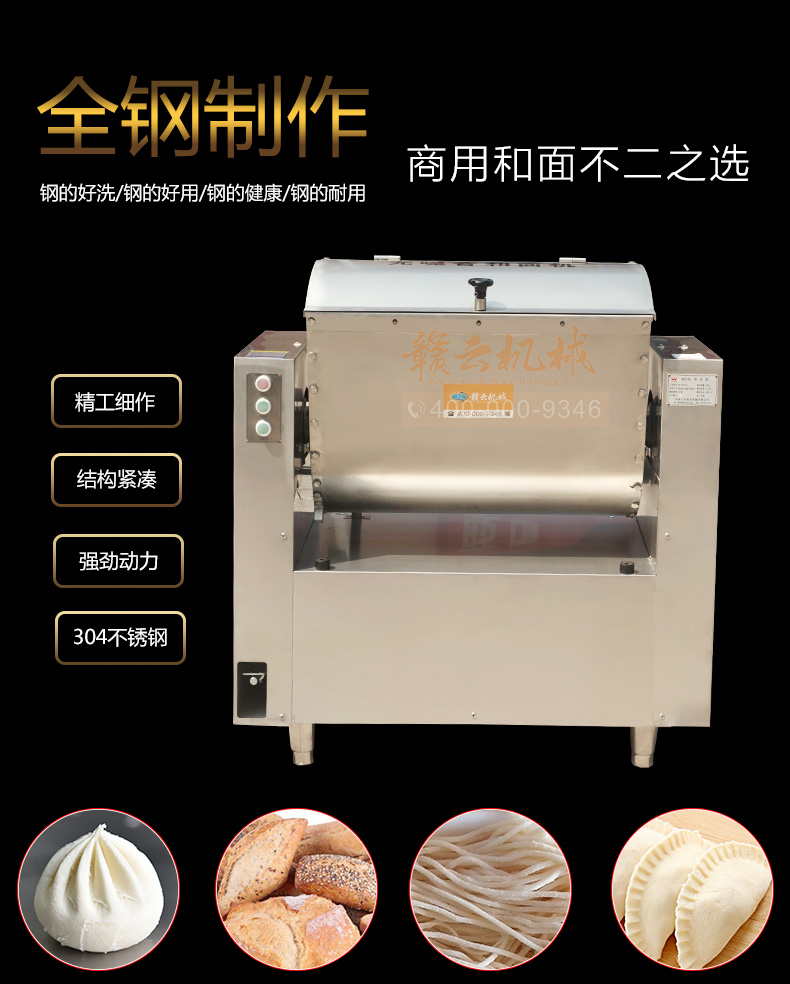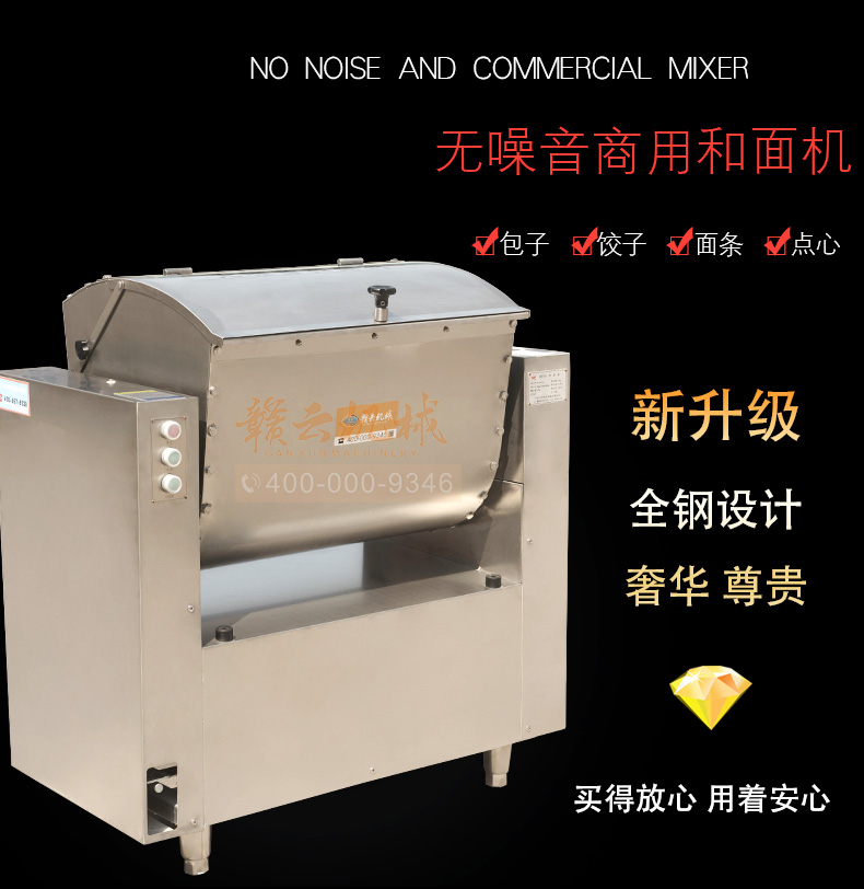 商用和面机,全不锈钢无噪音商用和面搅拌机,本系列有15kg、25kg、50kg、75kg、100kg、150kg6个型号,其中15kg、25kg为手动倒料,50kg以上有自动翻斗倒料,本机器和面搅拌桶及搅拌轴均采用304不锈钢抗氧化处理设计,安全卫生,机体采用201不锈钢板材,组合而成全钢和面机构架。符合军供品质卫生需求。是商用和面搅拌好助手。