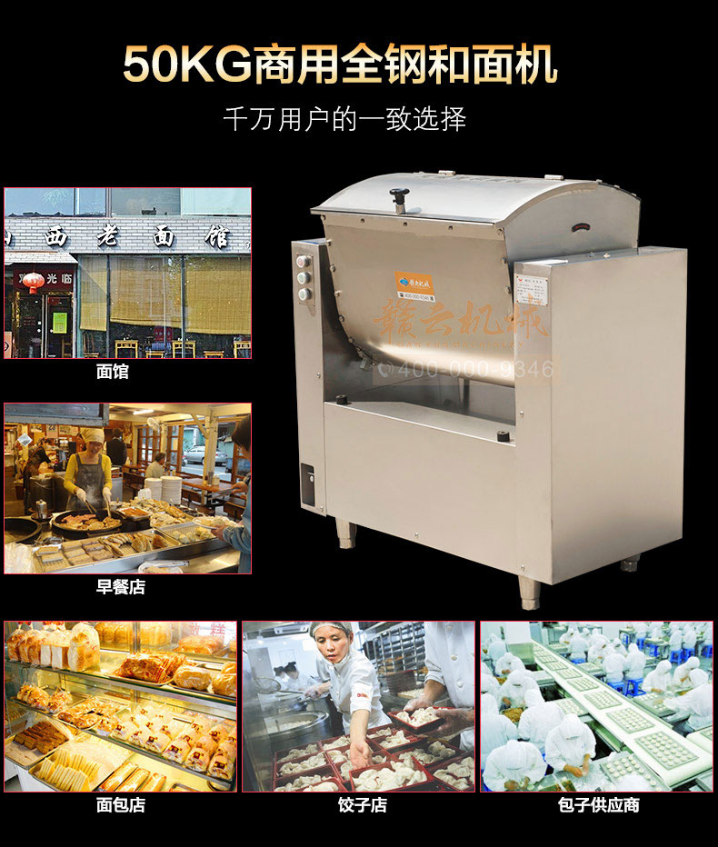 商用和面机,全不锈钢无噪音商用和面搅拌机,本系列有15kg、25kg、50kg、75kg、100kg、150kg6个型号,其中15kg、25kg为手动倒料,50kg以上有自动翻斗倒料。