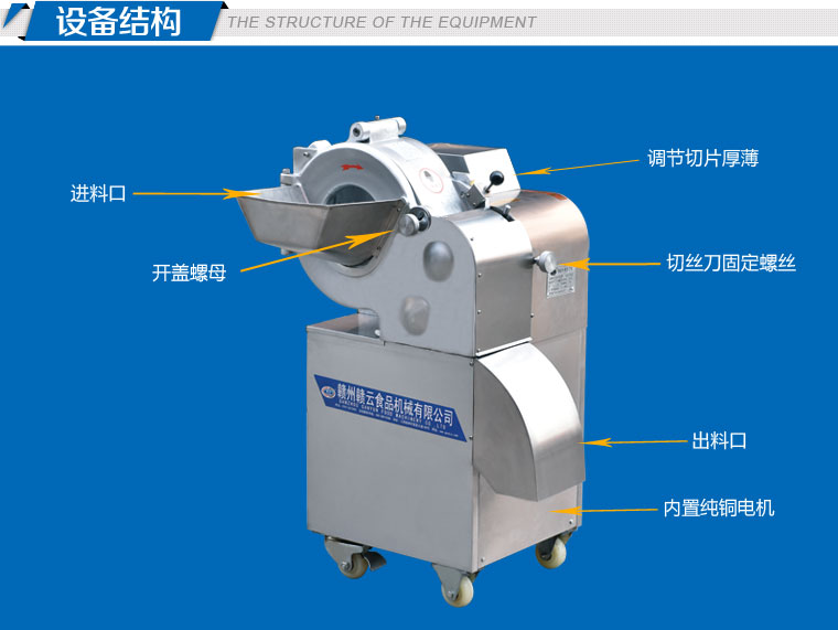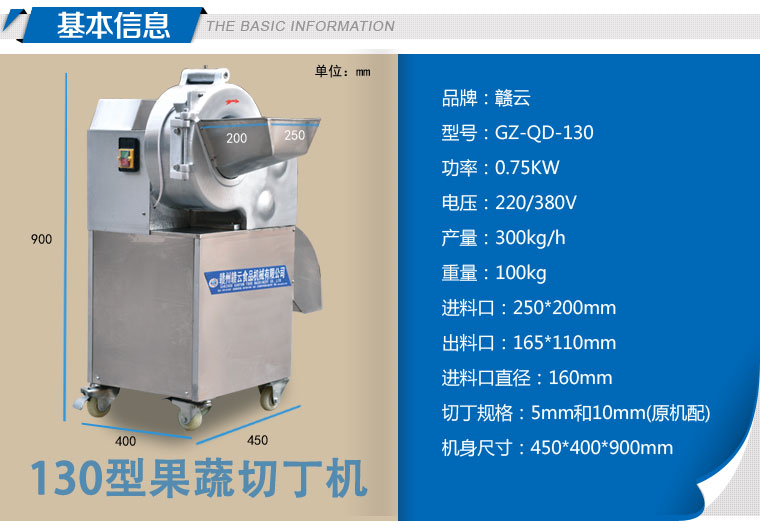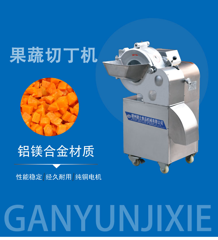 GY-QD-130型专用切丁机主要部件采用铝合金和不锈钢材质,以保证长期工作不生锈、不腐蚀、无毒、无害,符合食品卫生加工要求,适用于脱水蔬菜、速冻蔬菜加工及食品酱菜行业加工各种根、茎类蔬菜成小立方体或长方体形状,该机采用复合刀具,一次成型,形状规则、切片光滑,成型效率高,操作方便、能耗低,深受食品加工伙伴青睐。