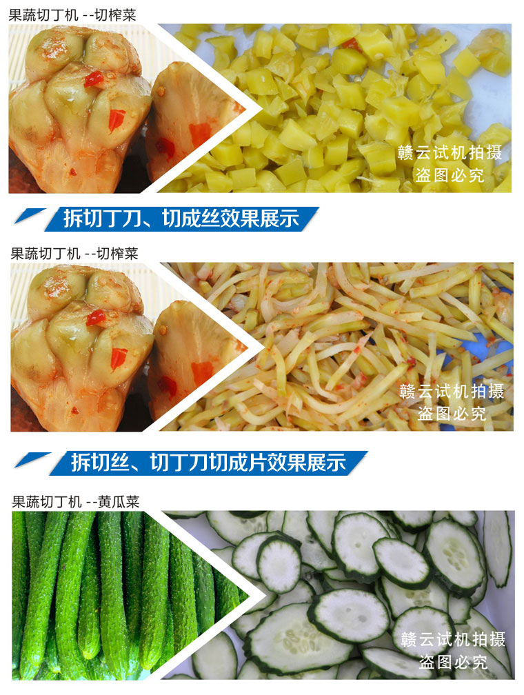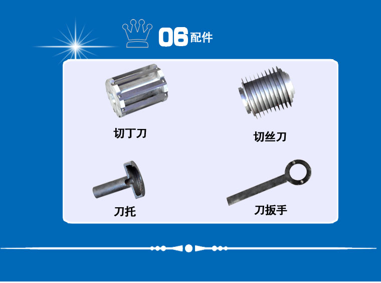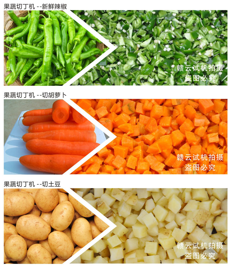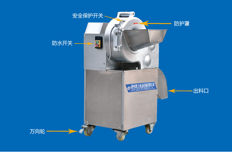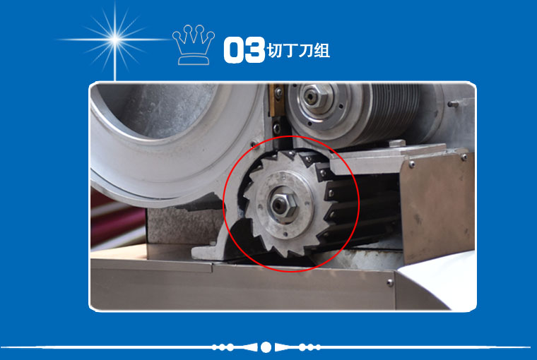 工作原理:gy-dq-130型切丁机通过旋转拨盘将被切物体带动高速旋转,利用物体的离心力,立刀将物体切成片状,然后经过圆盘切丝刀片竖切成条状,并将条状物送入横切断刀口,由横切断刀盘切刀切成所需的长方体或立方体。