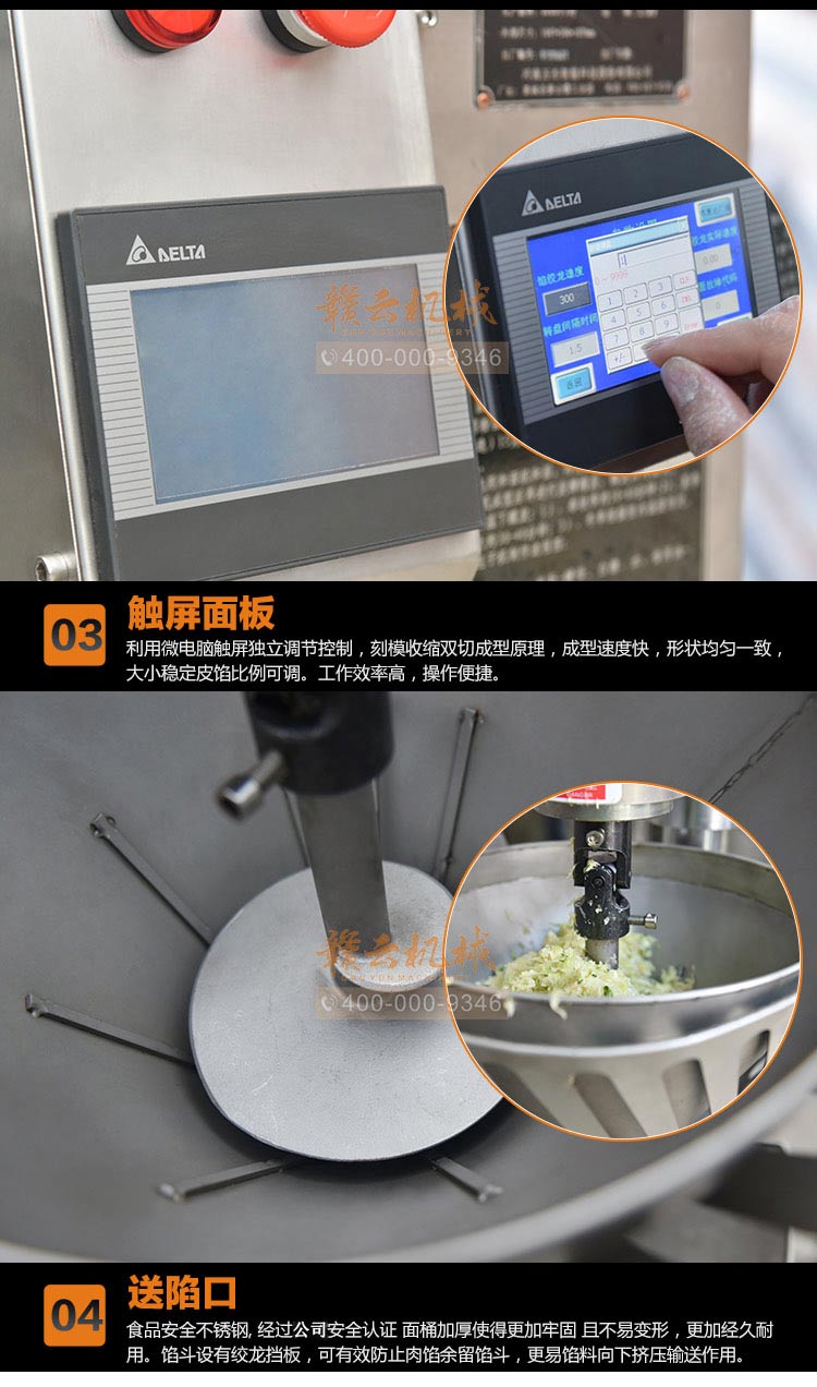 新型智能包子机利用微电脑触屏独立调节控制,刻模收缩双切成型原理,成型速度快,形状均匀一致,大小稳定、皮馅比例可调。与传统包子机和早期系列型号相比,无论工作效率、智能控制、还是环保卫生方面都有很大的提高。适用于面食加工厂、企事业单位食堂、包子店等。