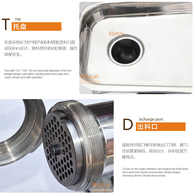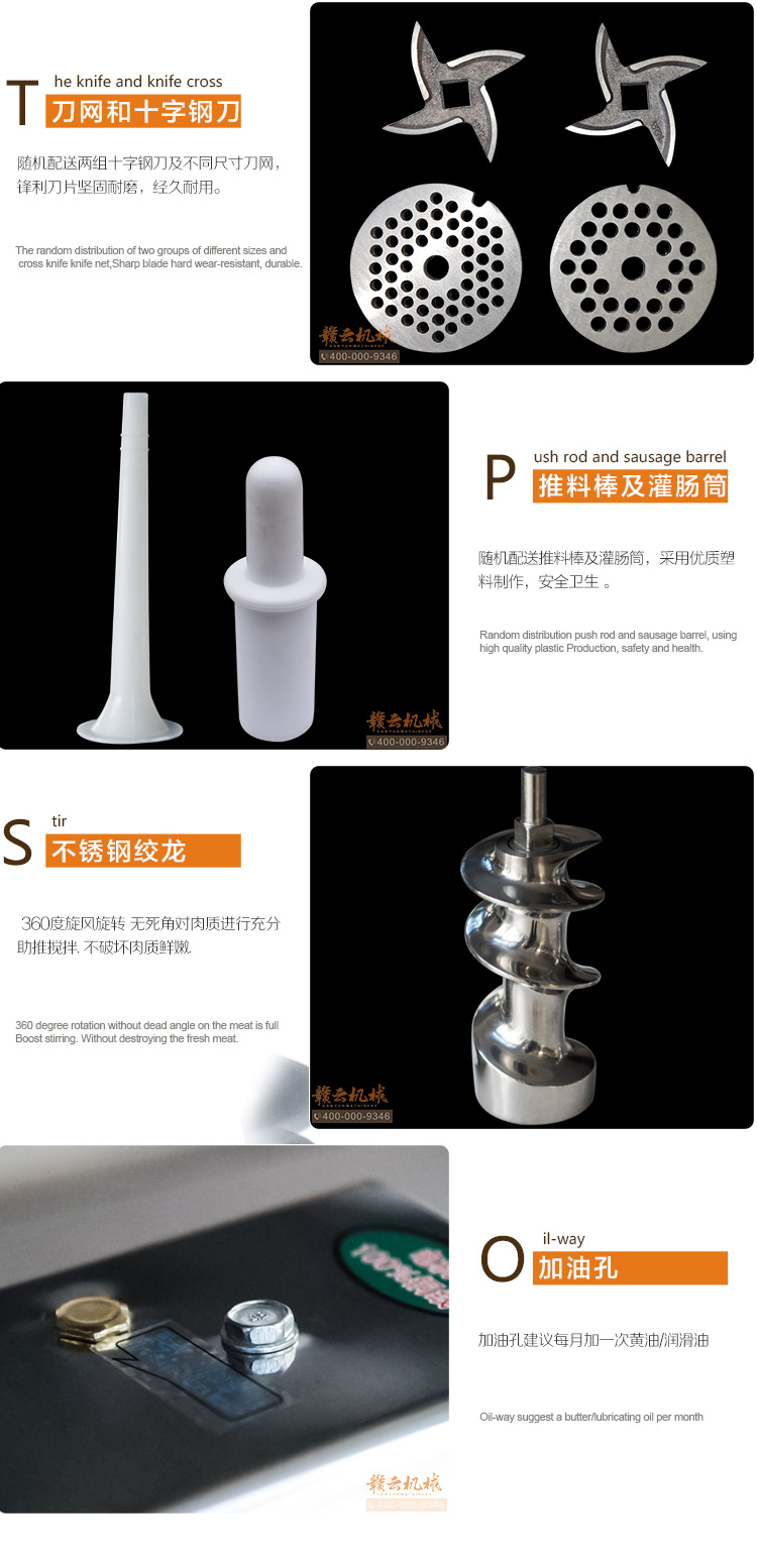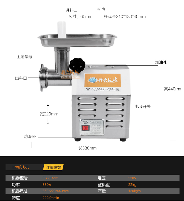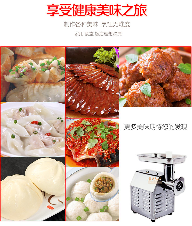 赣云台式新款绞肉机 不锈钢精品配铜线电机 做工升级 品质好,冬季绞肉灌肠好设备,可绞肉末,可绞干货,绞生姜大蒜等,配灌肠筒可灌制香肠腊肠,绞龙采用食品级不锈钢,符合食品卫生需求。欢迎选购。