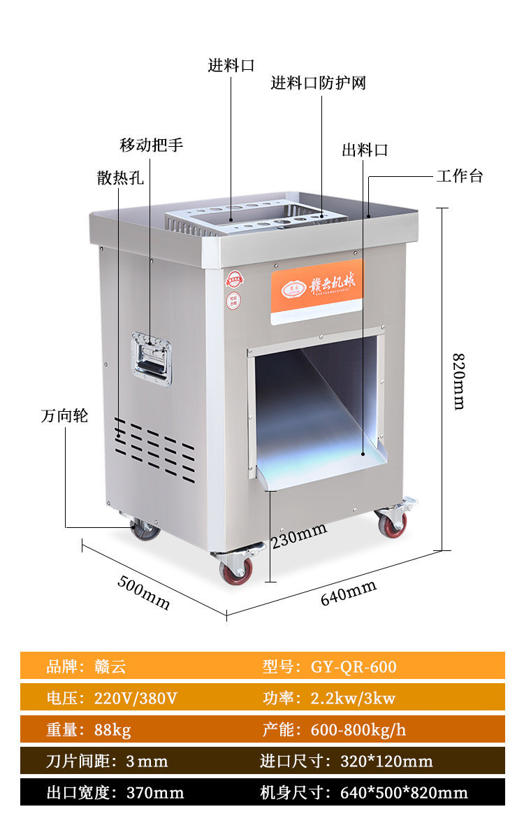 赣云工程款切肉机,可以切各种肉类,切片、切丝、切末一机搞定,也可以切软蔬菜,例如:榨菜、魔芋、香菇、辣椒等,赣云新款切肉机配置新升级,使用优质大功率电机,采用不锈钢机身,机器机身清洗方便,增加安全防护,加大了入料口,增加工作效率,新款商用切肉机一机多能,可以满足多样需求。