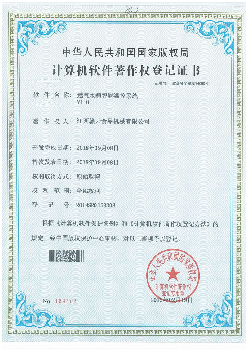 计算机软件著作权登记证书(燃气水槽智能温控系统)