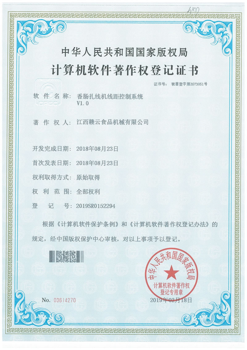 计算机软件著作权登记证书(香肠扎线机线距控制系统)