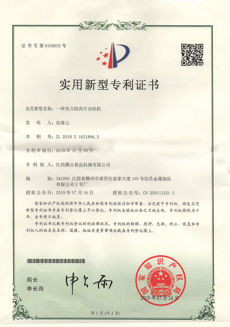 实用新型专利证书(双刀组肉片切丝机)