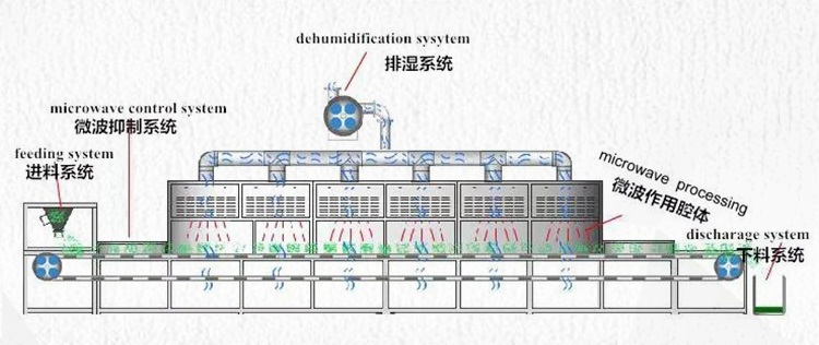 2.微波烘干区域:烘干区域是一个位于隧道中间区域,待烘干的物体通过输送带进烘干室内进行快速烘干。烘干室通常排湿系统和输送系统,周边由金属材料构成,以防止微波辐射泄露出去。