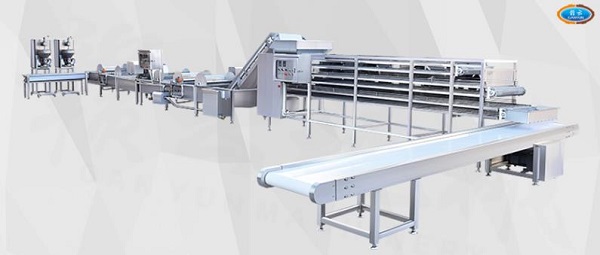 将新鲜成型的鱼丸传输到低温定型线上,通过控制设备的温度达到低温冷却鱼丸的效果,增加鱼丸的质感。