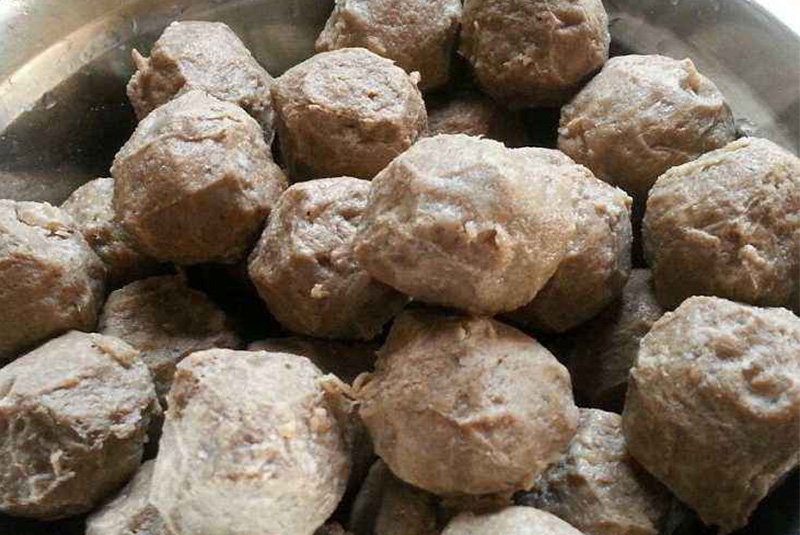 因为选用新鲜的牛腿肉作料,去筋后切成块,放在大砧板上,用特制的方形锤刀两把(重量3公斤左右),上下不停地用力把牛腿肉槌成肉浆,加入少量雪粉、精盐、上等鱼露和味精,继续再槌15分钟,随后用大钵盛装,加入方鱼末、白肉粒和味精,拌匀,用手使劲搅挞,至肉浆粘手不掉下为止,然后用手捻肉浆,握住拳头控制从大拇指和食指成环状中挤出丸,用羹匙掏下放到温水盆里,再用慢火煮丸约8分钟,捞起牛肉丸。食时用原汤和牛肉丸下锅煮至初沸(煮时水不能太沸,否则牛肉丸不爽滑),家里自己制作可以使用这个方法。