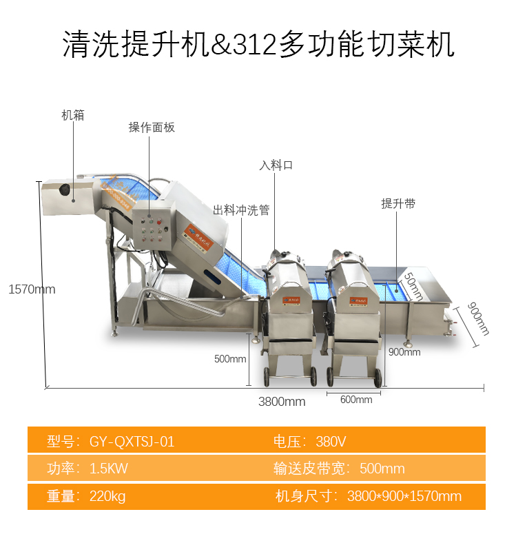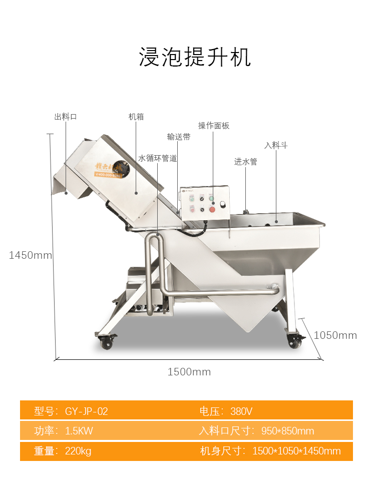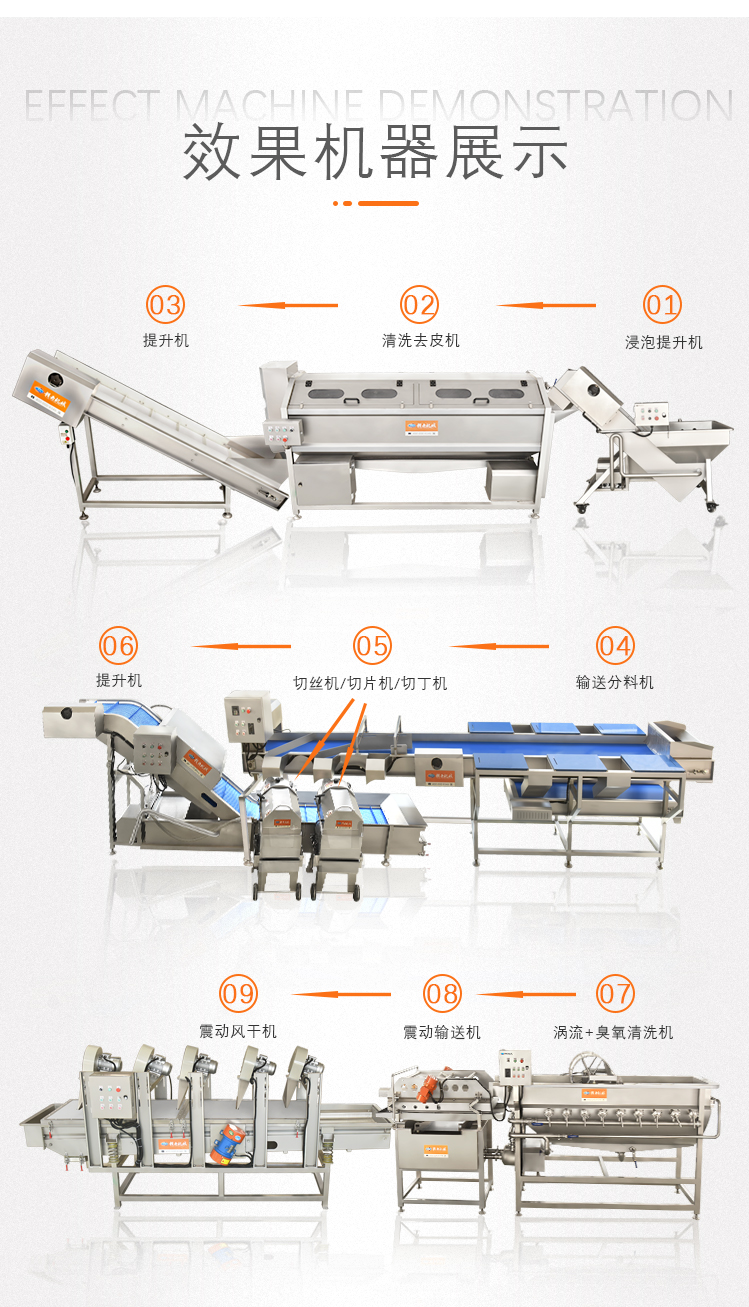 他集浸泡机,清洗机,提升机,切割机,风干机等多种机器为一体,实现了瓜果从刚摘到可下锅炒的全部过程,完美的节省了人力及时间,下面的图片将详细介绍这些设备。