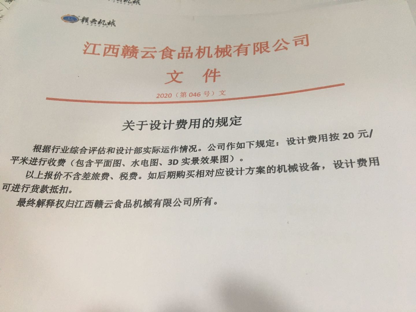 根据行业综合评估和设计部实际运作情况,公司作如下规定:客户如需赣云食品机械进行布局规划设备摆放等规划(平面图,水电图,3d实景效果图)等需要按照20元/平米进行收费。