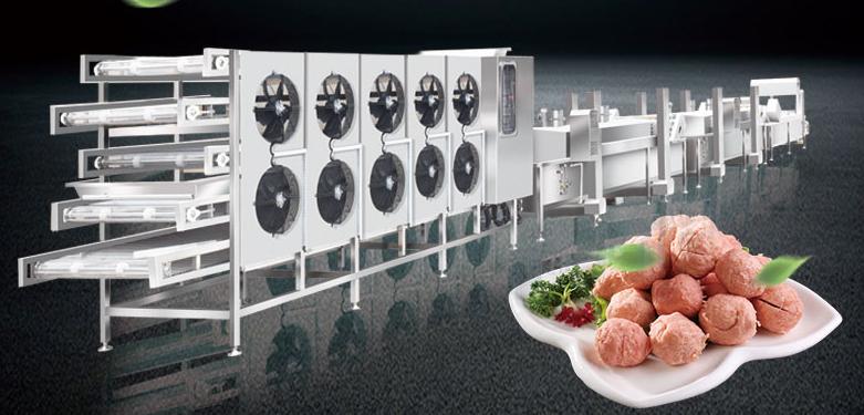 设备流程展示:冻肉切块机―输送提升机―绞肉机―智能液压升降打浆机―变频双调速肉丸成型机―肉丸缓冲区―低温定型流水线―高温熟化流水线―水冷槽―提升机―多层风冷线