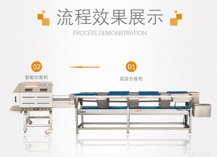 蔬菜经人工挑选预处理后放入相应分选输送带,输送至多元化数字切菜机中进行切割,并由提升机提升至涡流振荡清洗机内进行清洗,利用臭氧发生器保证物料的鲜度,后经高频振荡机冲洗过滤,为避免氧化变质,可真空包装并冷鲜保存。