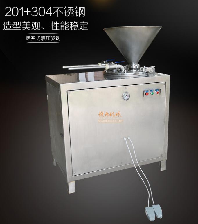 不锈钢液压灌肠机是一款可灌制不同肠类的机器,比较适用于:家乡腊肠、火腿肠、肉泥肠、红肠、广式腊肠等不同类似和风味的香肠。机器采用不锈钢材料、料斗、工作缸、液压操作系统和电气系统组成,主要工作原理是通过操纵转阀控制活塞的往复运动,以完成吸料与挤料的运作,达到连续灌肠的目的,机器拥有两个出料管,50L的大容量料桶,让灌制香肠的效率更高。
